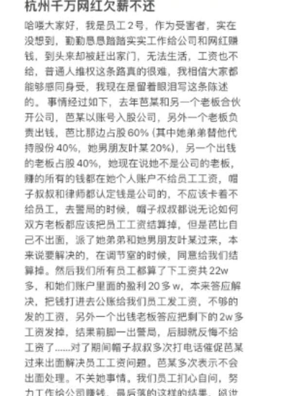 根据该员工爆料,从今年下半年开始,员工的工资发放就开始出现异常,团队里面很多人的薪酬已经累计超过二十万没有发放,目前已经选择了报警求助,更有网友爆料芭比迪丽拉此前与投资方合伙开公司,直播收入也没有按期打入到公司的账户上。