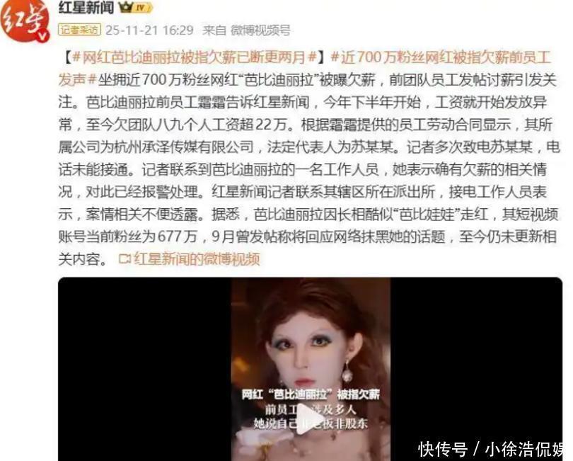 网红芭比迪丽拉因为“真人芭比”的形象迅速在网络上走红,凭借着自己的混血立体五官,还有精致的妆造以及剧情短视频让她成为了千万级的网红,可是就在最近,芭比迪丽拉却被团队员工爆出欠薪,而这件事情也是很快登上了热搜。